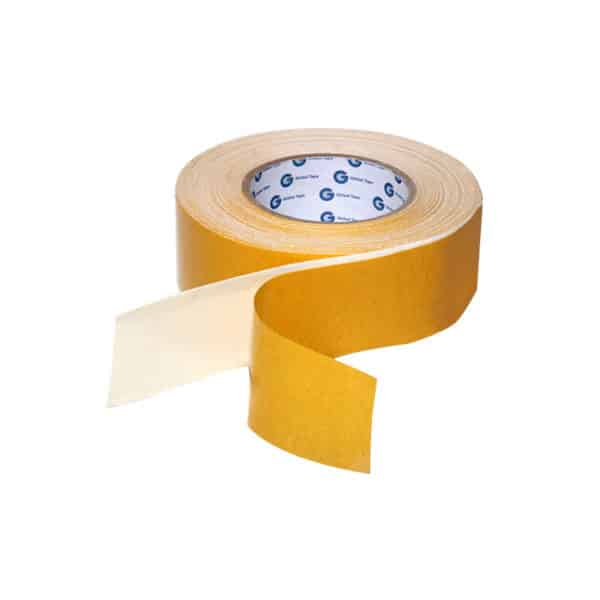 Fita adesiva dupla face, com dorso de tecido 100% algodão, contendo adesivo à base de borracha e resina, com liner de papel amarelo siliconado.